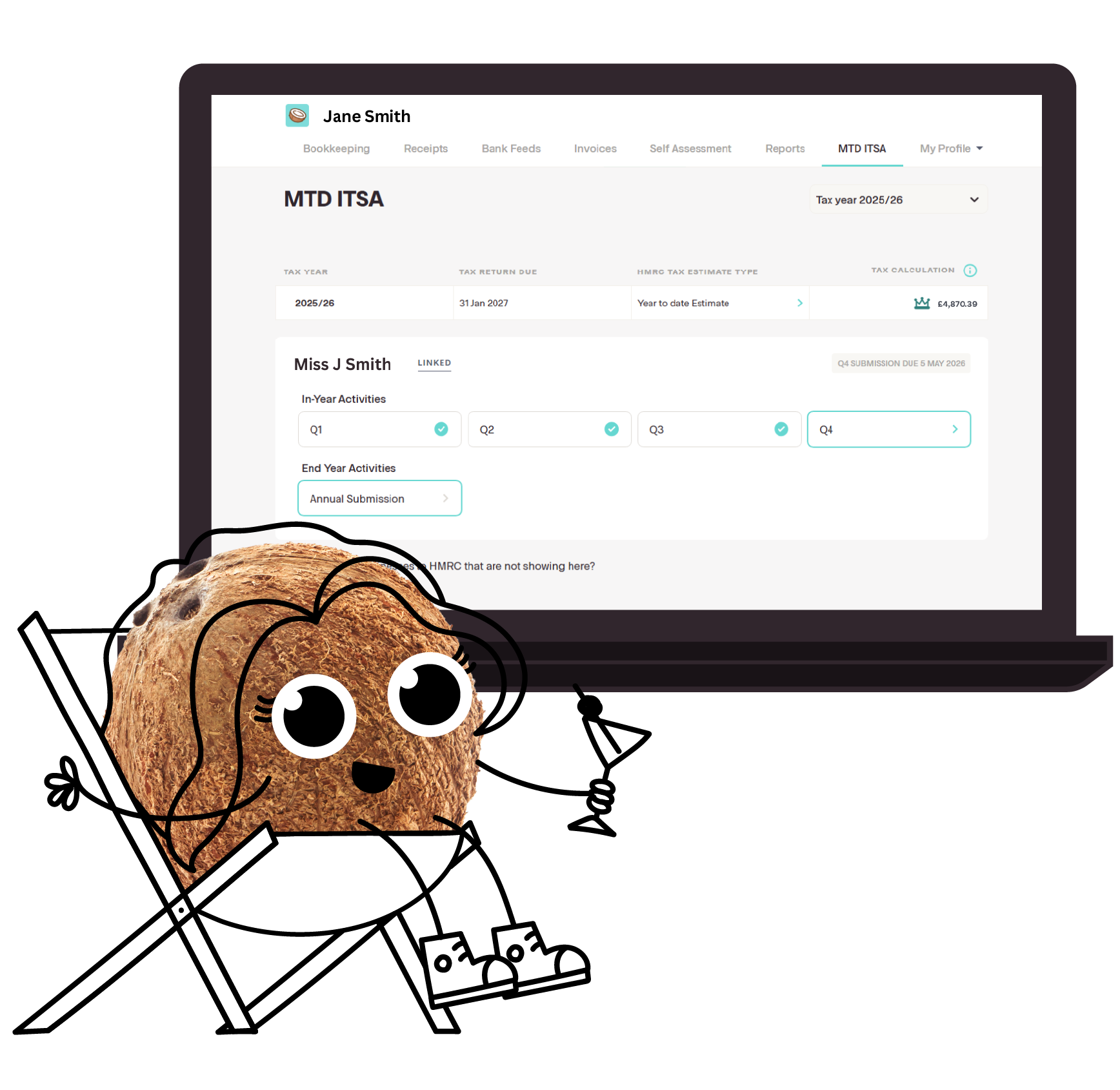 Send your income and expense totals to HMRC at least once a quarter. !Coconut ensures your records are complete and formatted correctly so quarterly submissions are simple and error-free. You’ll receive real time tax estimates every time your send an update.